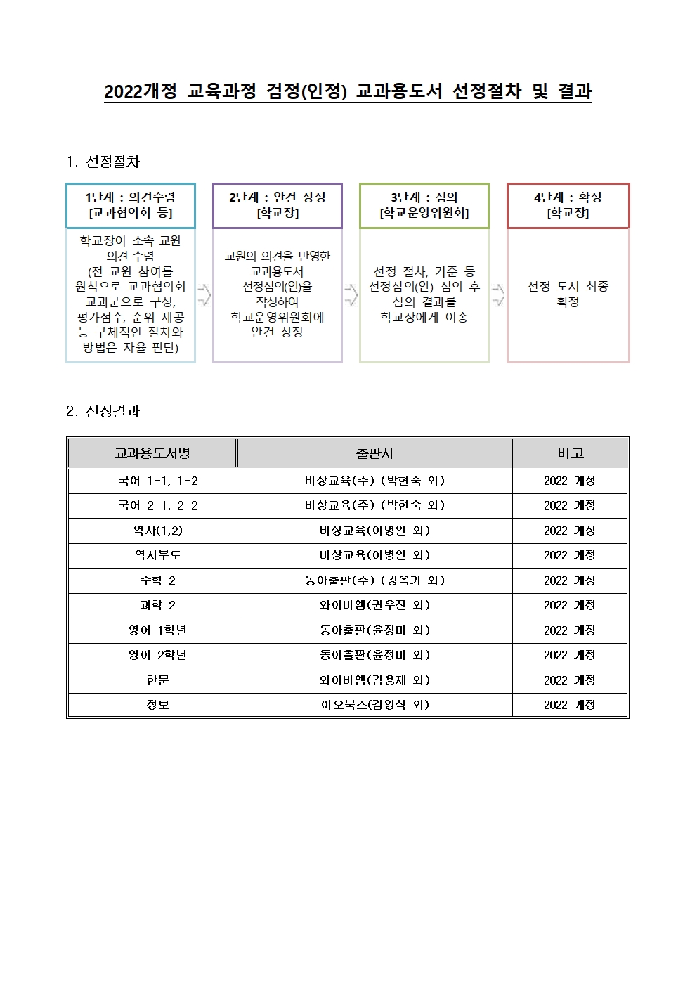 2022개정 교육과정 교과용도서 선정절차 및 결과를 첨부 파일과 같이 안내드립니다.